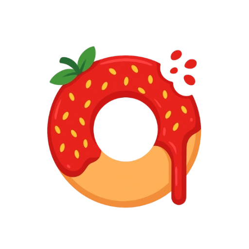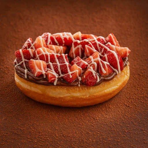 Donuts coberto de avelã, morango,banana ou uva e finalizado com riscos de chocolate branco.